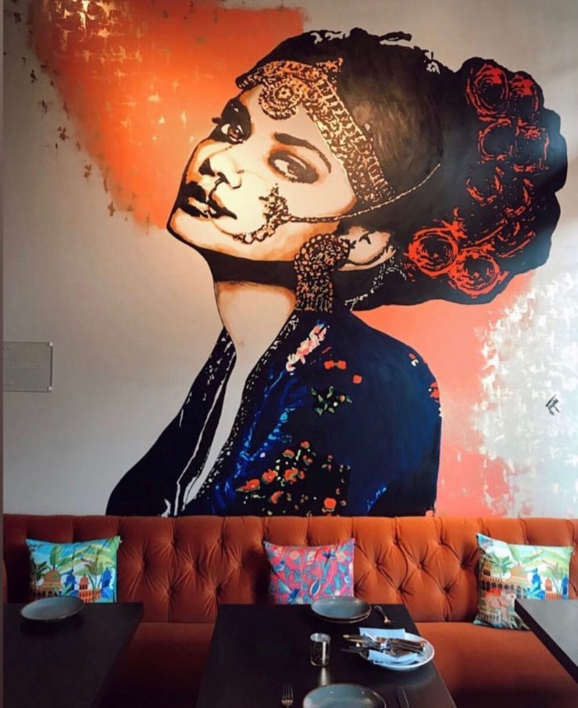 West Loop restaurant Federales Chi invited Vyas to create a pair of wings inspired by Kelsey Montague’s once-iconic and now ubiquitous concept. The restaurant wanted her distinct style (then centered around tight figurative painting) paired with graffiti elements. Vyas invited local artist Czr Prz to collaborate with her, pairing his urban edge with her fierce femininity.