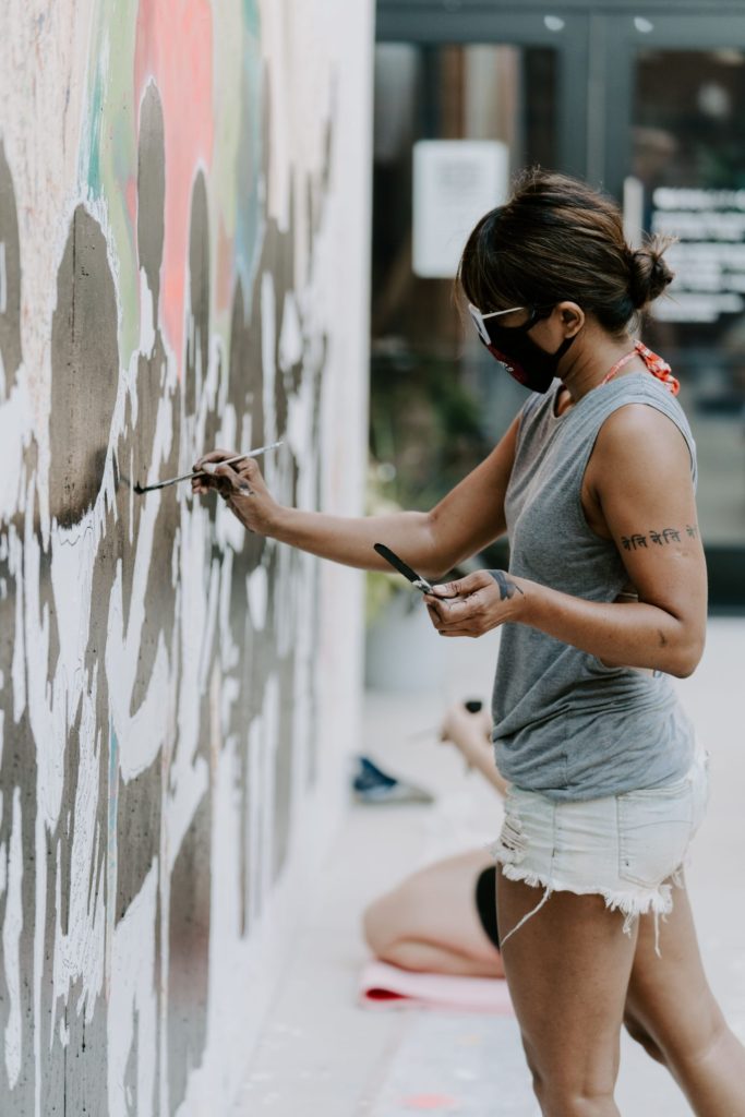 Vyas felt apprehensive about the opportunity. Sure, she’d painted some Disney characters in the gym of a daycare where she’d worked during college, but she’d never tried professional muralism. Although she’d always admired public artists for their ability to be “skinless and public” with their practice, she’d never imagined confronting the feat for herself. “To take that first step, to put your work out there and put yourself out there on that stage, on that scale, is terrifying,” Vyas remarked. “I never thought I would be part of that community and that culture.”