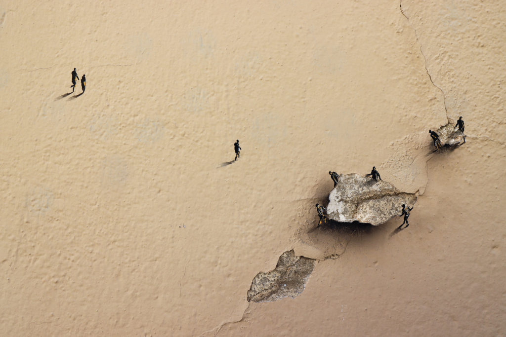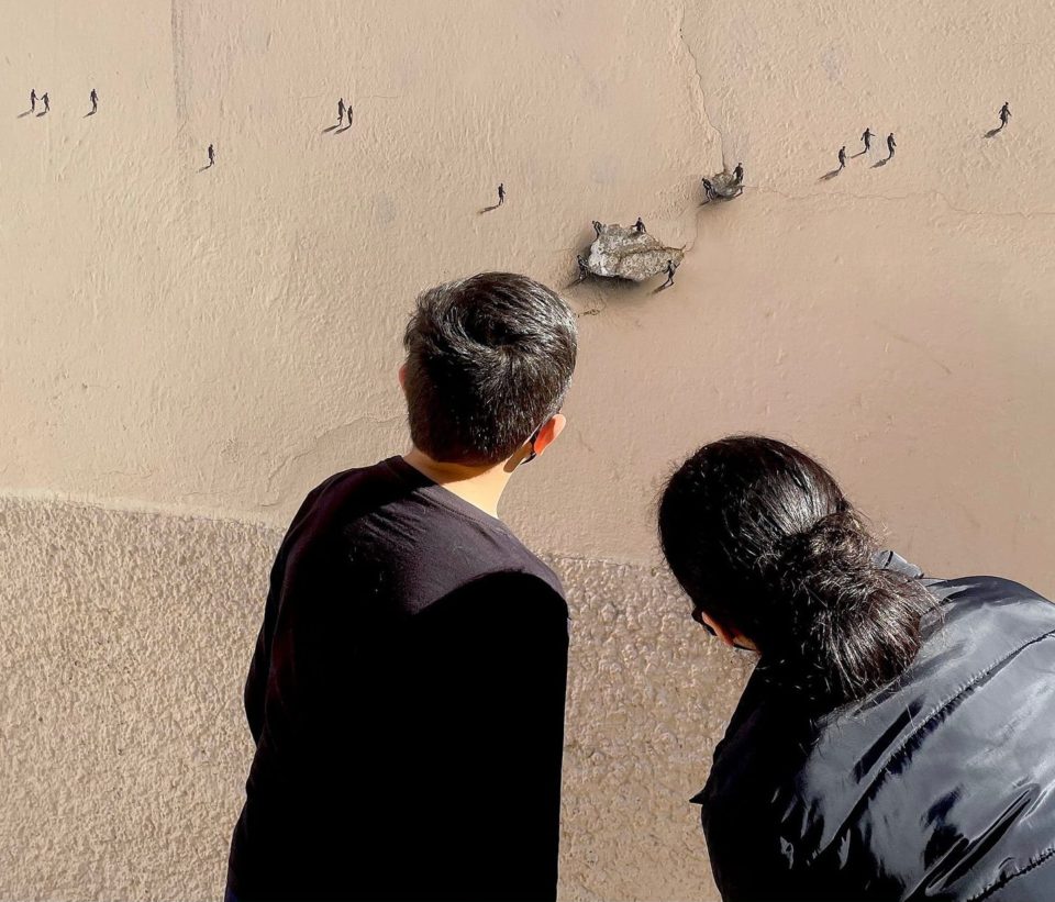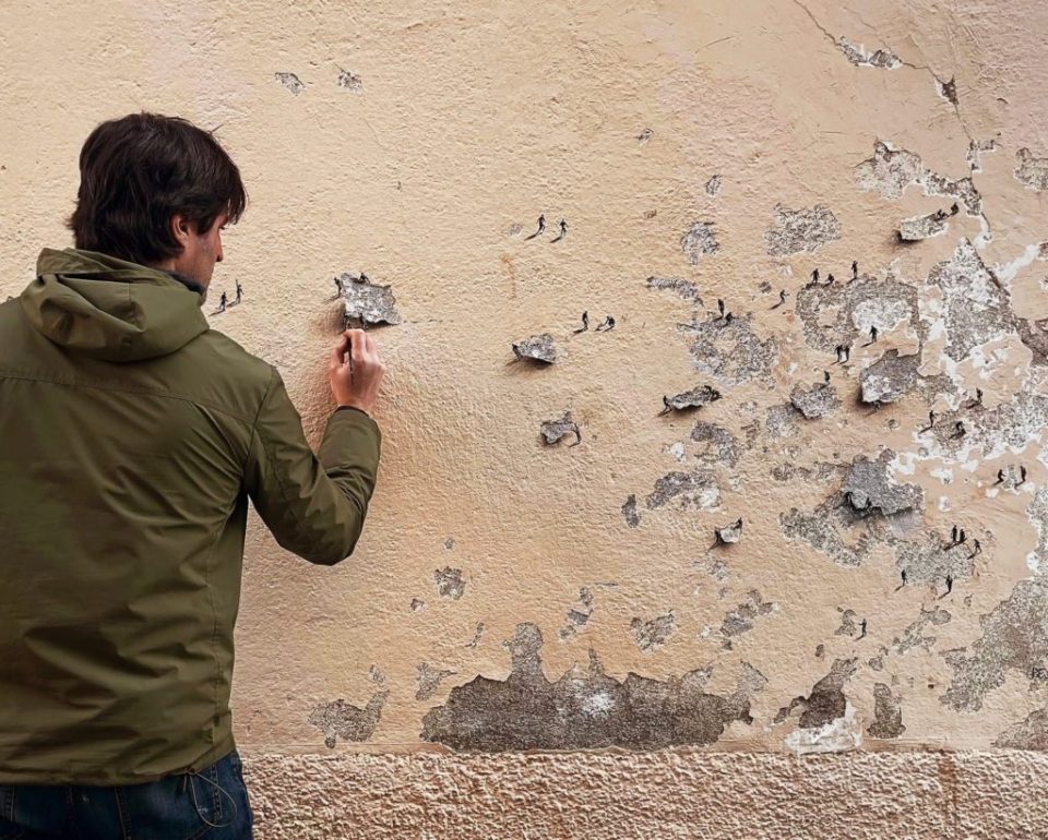 With his intervention, the artist not only resists restoring that which appears to lack value, but also carefully enhances the imperfections of the wall. With the goal of focussing attention on what already exists, Pejac deemed it sufficient to add discreet touches to the existing texture of the wall. Next to the areas of the wall where the paint has fallen off, the artist has depicted tiny groups of people who, in a collective and organized way, carry these “empty spaces” as if they were valuable objects.